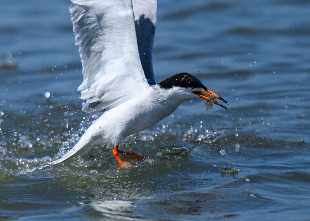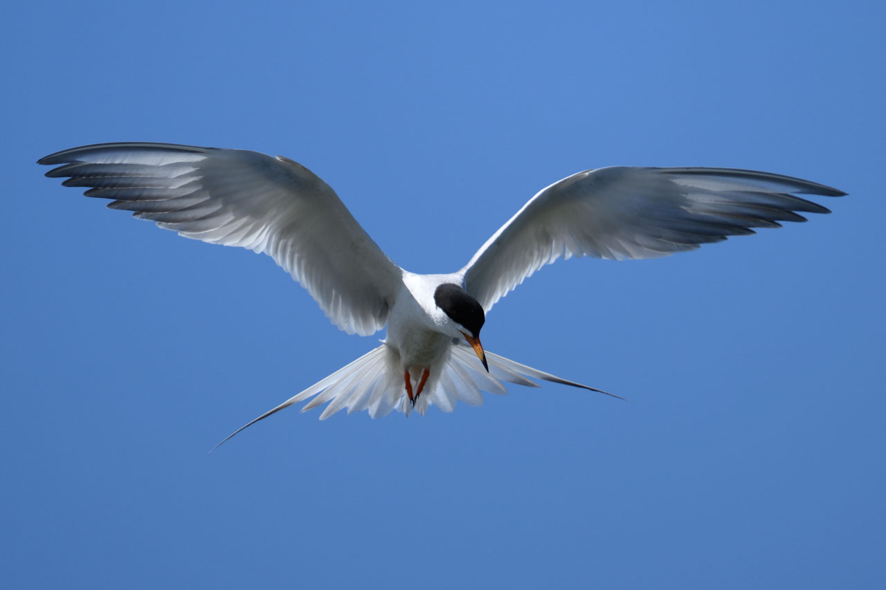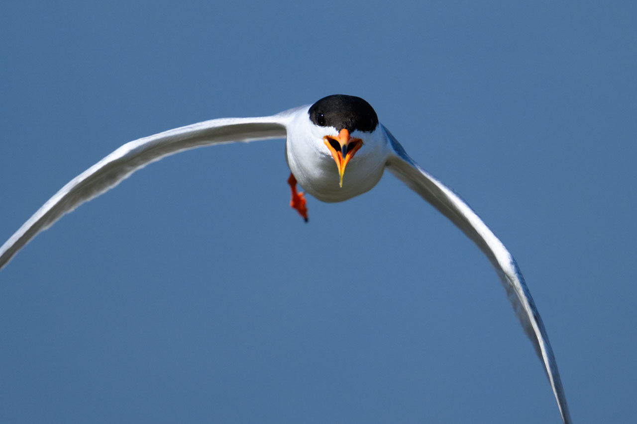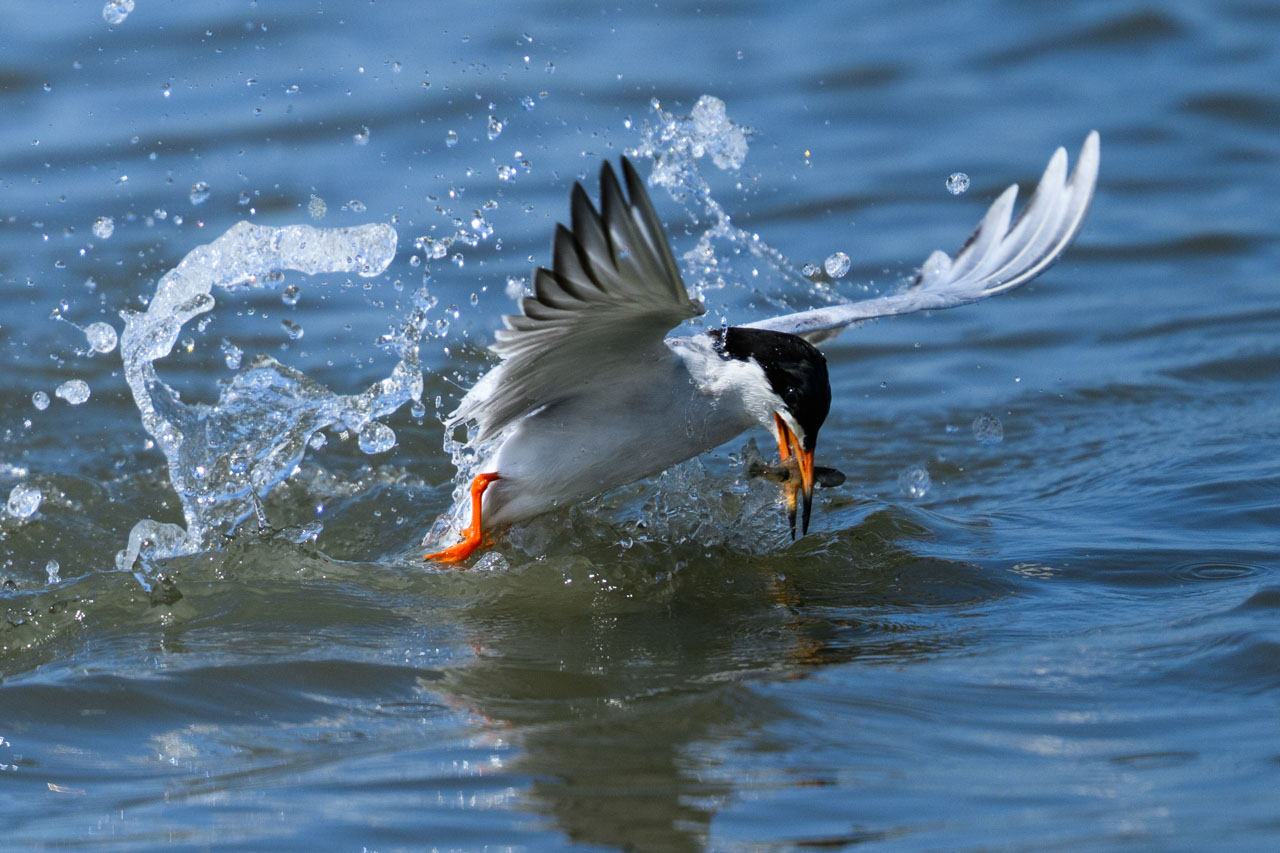 Almost immediately a Forster’s Tern appeared, flying surprisingly close.Just as I thought this would be rewarding to watch, its behavior changed—it flew straight toward me, turned nearby, then headed back. Apparently it was warning me off.Looking where the tern had lifted off, I saw several active nests. One bird kept its eye on me. Even with 50–100 meters of water between us, they were highly alert.One carried a fish away. Although they dove often, their success rate seemed low; Ospreys appear to have better aim.A tern hovered in place.This time it successfully caught a fish.A group of American White Pelicans glided past—common even in city parks. Brown Pelicans are more coastal and seldom seen inland.Skimming just above the water came a large tern, the Black Skimmer, probing the surface with its distinctive stepped bill.Perhaps some lazy tern once decided that dragging its bill through the water while in flight was easier than diving each time; I wonder how many generations it took to evolve into such a form.At the foot of Dumbarton Bridge, Cliff Swallows were busy building their nests.