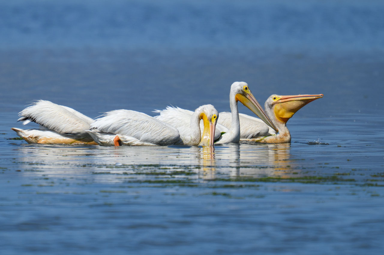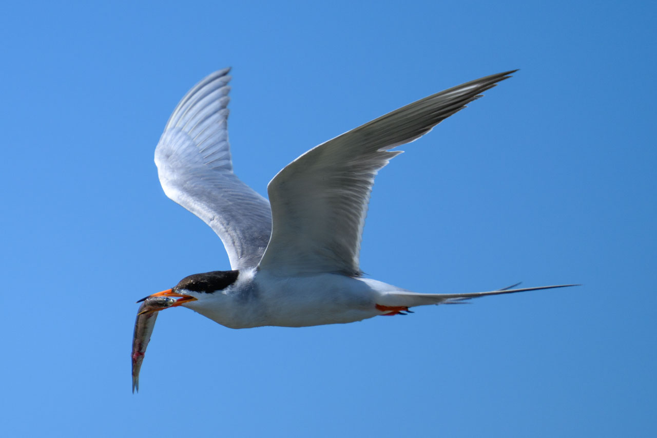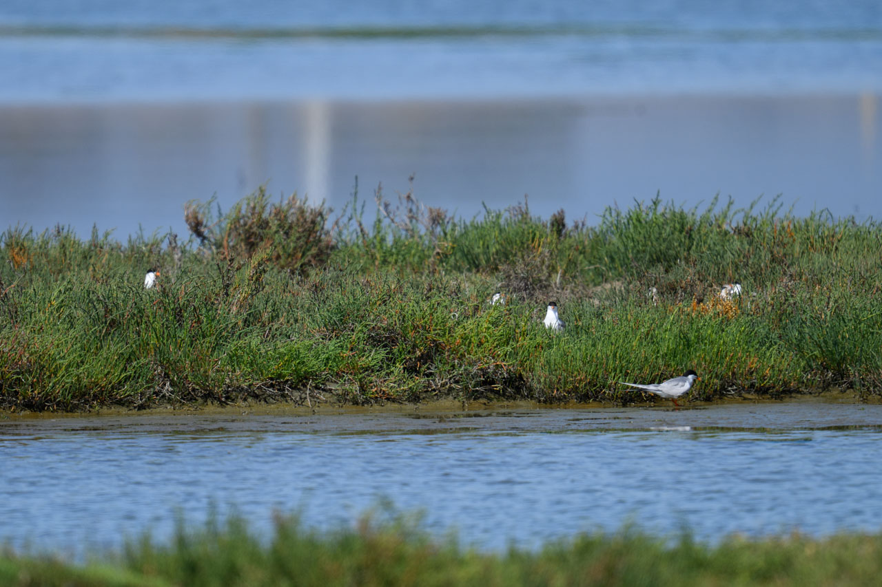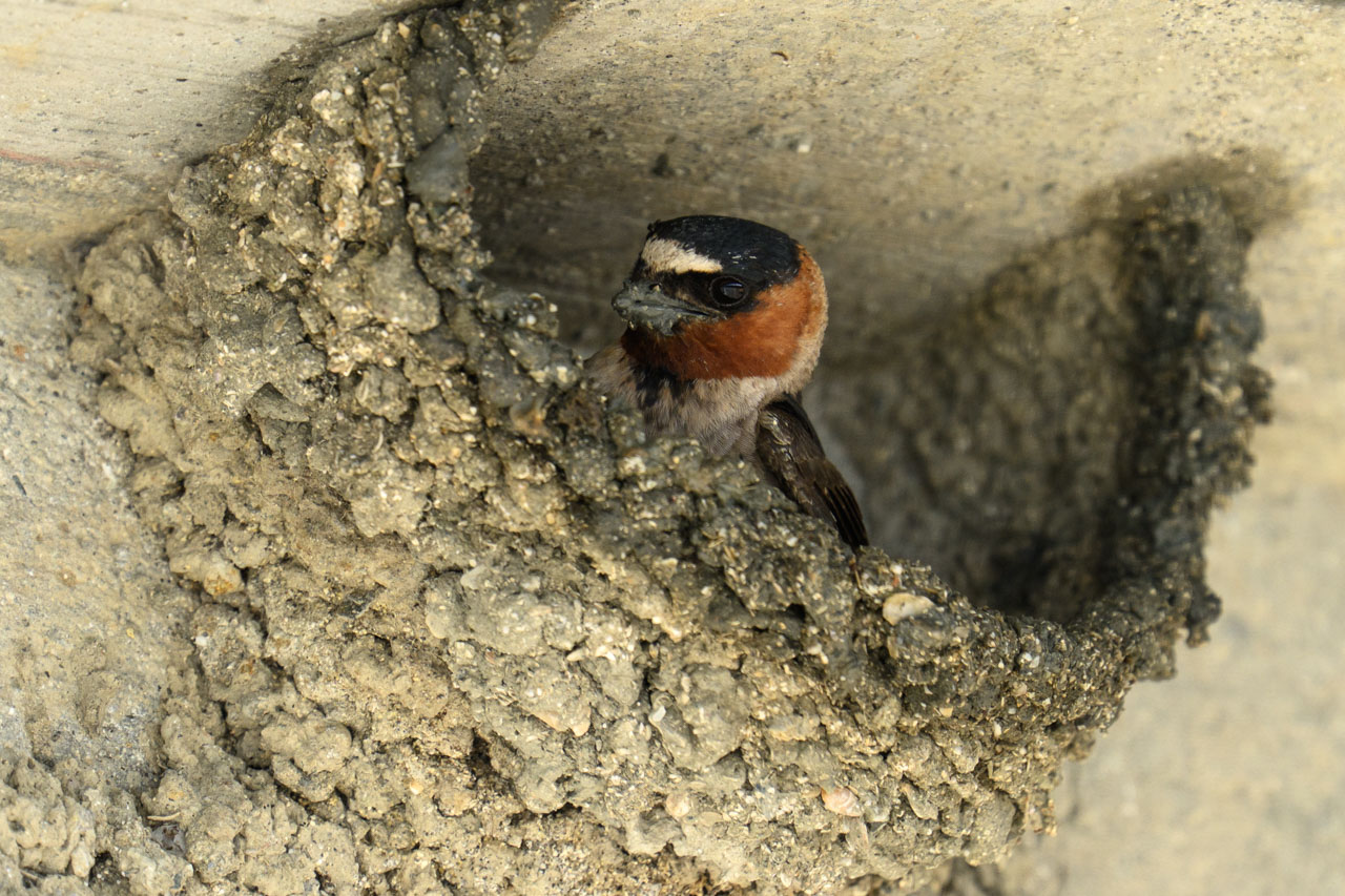 Almost immediately a Forster’s Tern appeared, flying surprisingly close.Just as I thought this would be rewarding to watch, its behavior changed—it flew straight toward me, turned nearby, then headed back. Apparently it was warning me off.Looking where the tern had lifted off, I saw several active nests. One bird kept its eye on me. Even with 50–100 meters of water between us, they were highly alert.One carried a fish away. Although they dove often, their success rate seemed low; Ospreys appear to have better aim.A tern hovered in place.This time it successfully caught a fish.A group of American White Pelicans glided past—common even in city parks. Brown Pelicans are more coastal and seldom seen inland.Skimming just above the water came a large tern, the Black Skimmer, probing the surface with its distinctive stepped bill.Perhaps some lazy tern once decided that dragging its bill through the water while in flight was easier than diving each time; I wonder how many generations it took to evolve into such a form.At the foot of Dumbarton Bridge, Cliff Swallows were busy building their nests.