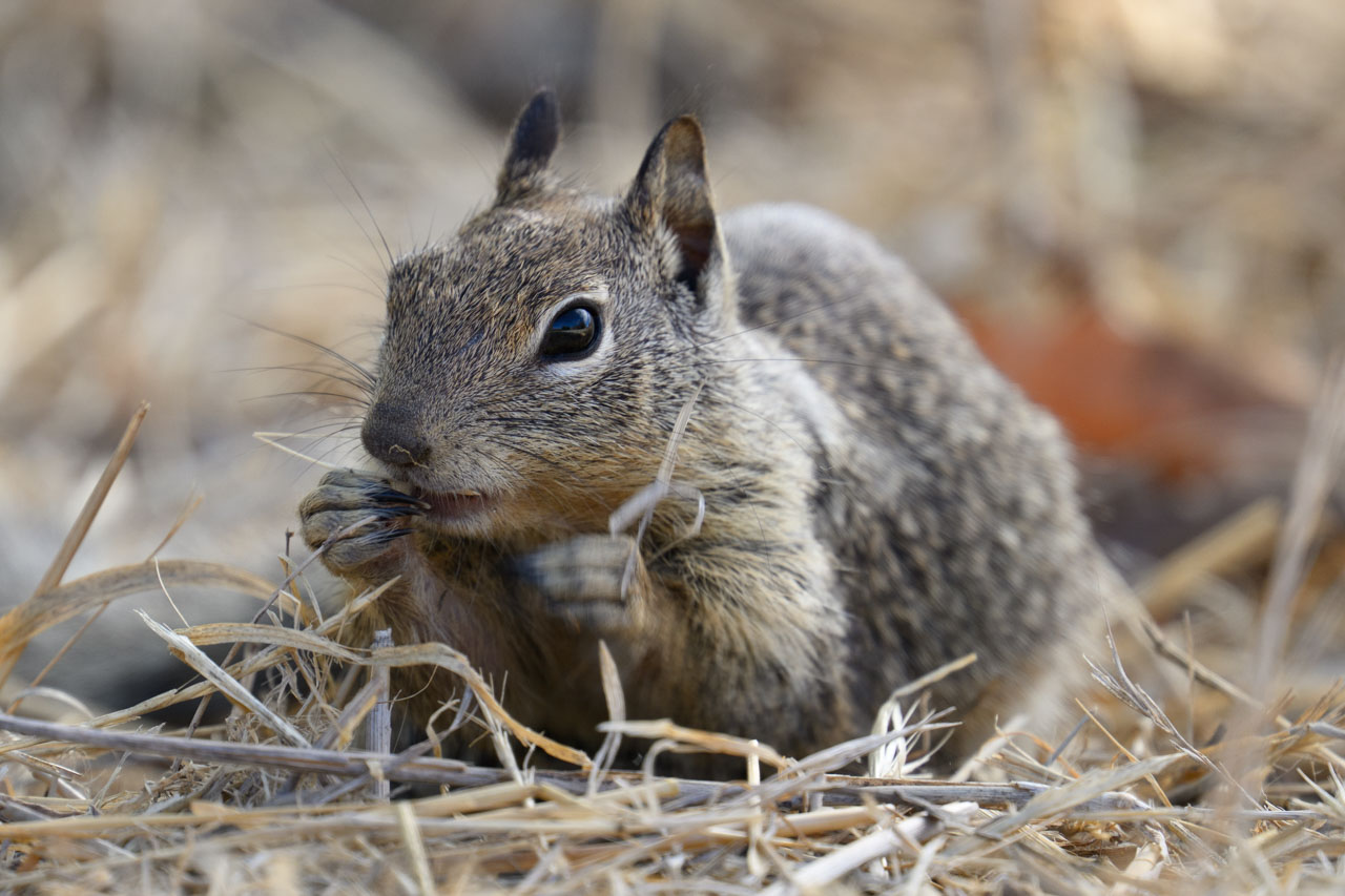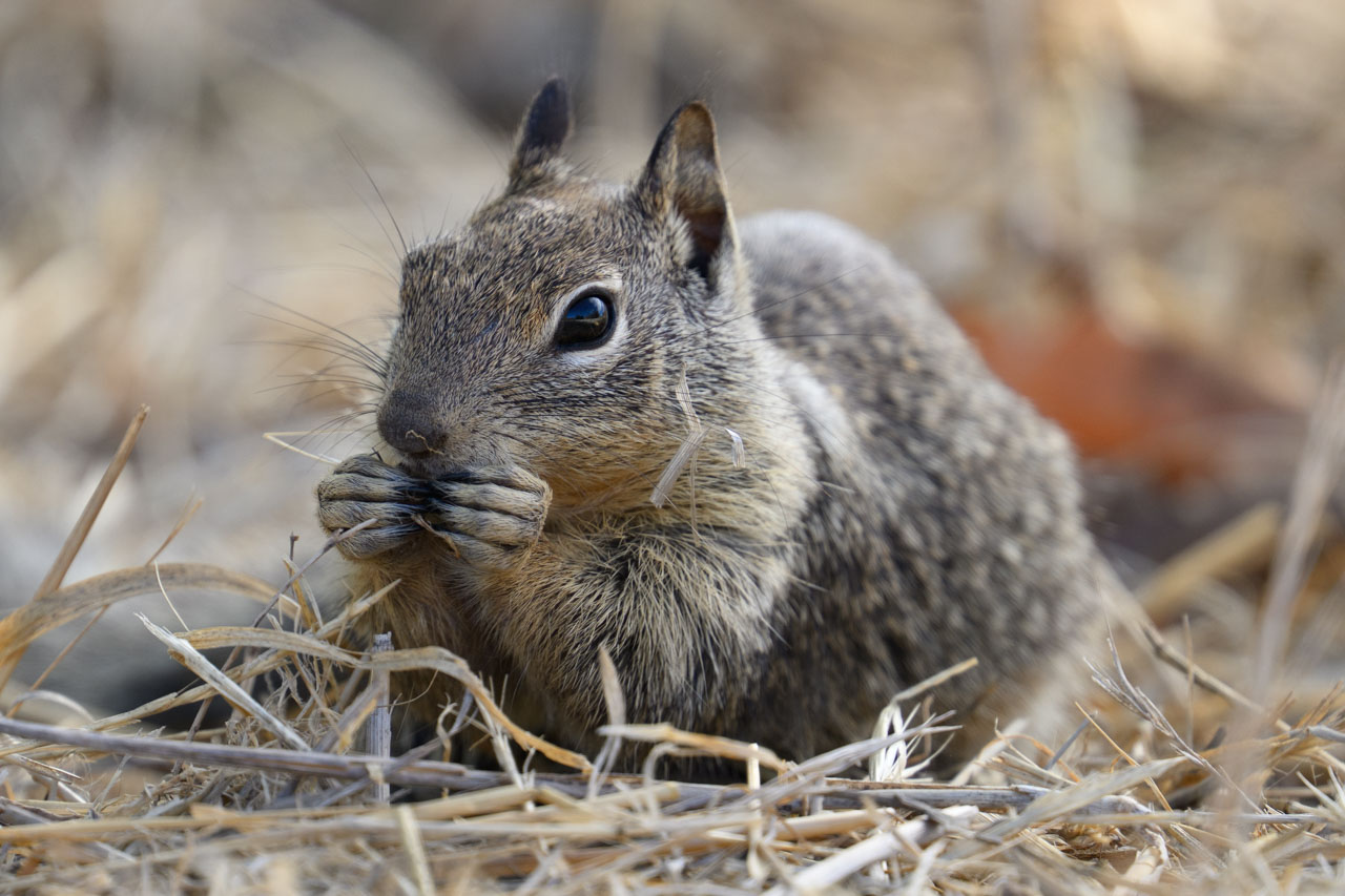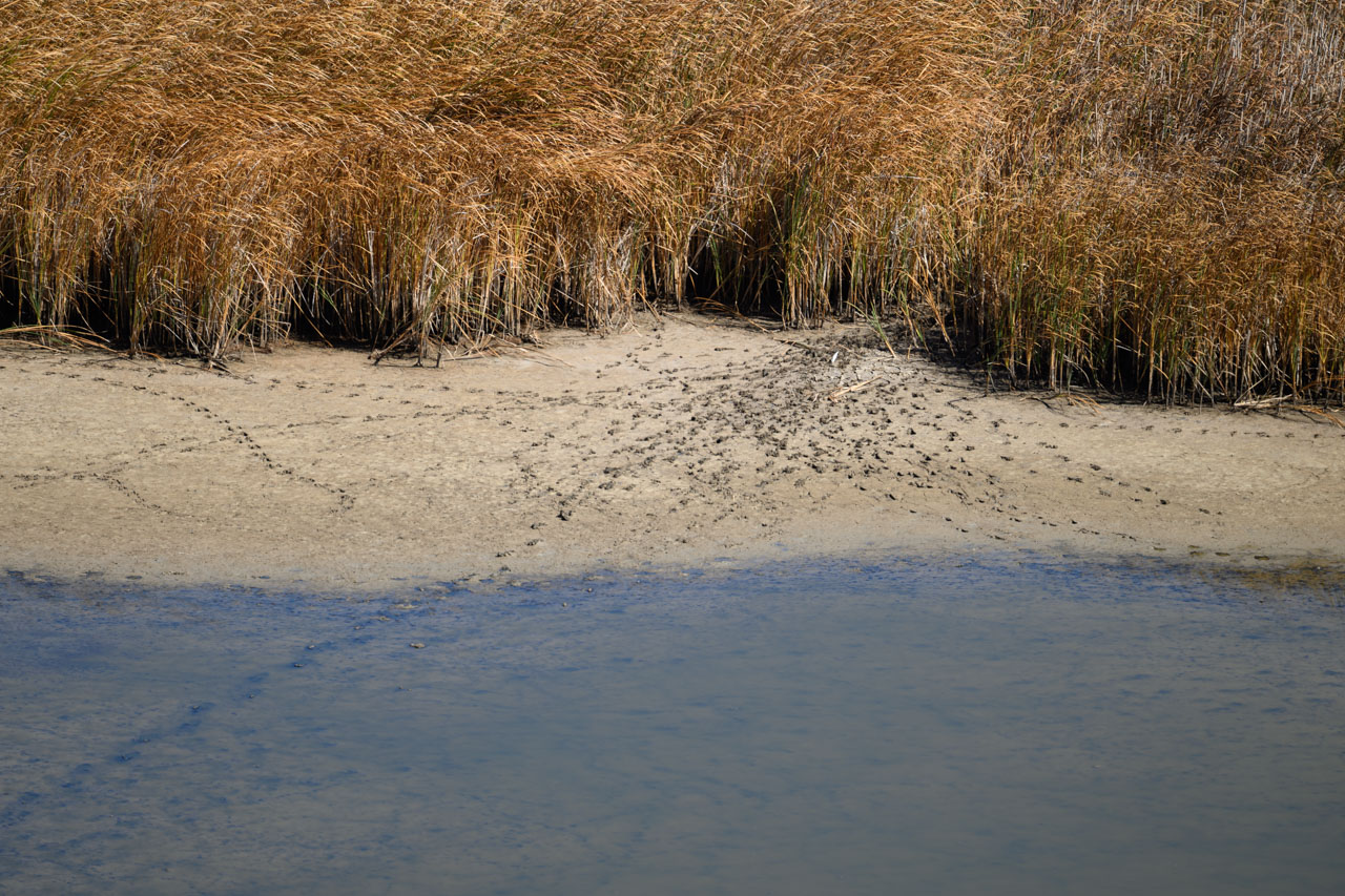 A California Brush Rabbit, looking exactly like the textbook image of a rabbit. Jackrabbits, on the other hand, look a bit like kangaroos.The familiar California Ground Squirrel, busily eating what seemed to be grass seeds or something similar.Munching away with both hands.The California Scrub-Jay again, also seen in the previous post.I could see my own reflection and the surrounding scenery in its eye.A lizard that hasn’t appeared in the blog for a while—likely a Western Fence Lizard.While walking the trail in search of rabbits, I often came across droppings packed with fur. They were probably from a coyote that had preyed on a ground squirrel or similar animal.Along the wetland edge, there were numerous animal tracks. They seemed to include rabbit prints among others. Since this area isn’t frequented by dogs, coyotes must also come here.